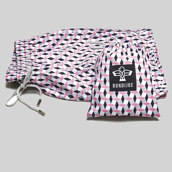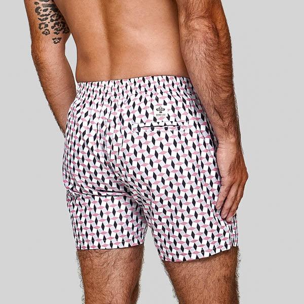 The Alfred Mens Swim Trunk is made for the summer. This bold geometric print with pops of pink. black and gray is sure to impress. Wear them all day long in comfort – the Alfred is designed to go from beach to bar. sunset to sunrise! The Alfred will be the most comfortable pair of mens swimwear you will ever own.